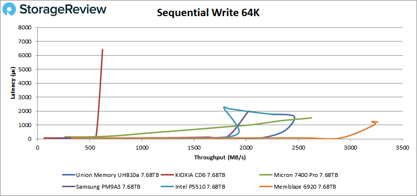 在64K寫入中,UH810a的性能峰值為2.5GB/s (39K IOPS),延遲為 1,616μs。