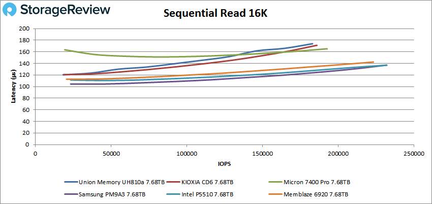 接下來是16K讀寫性能。在讀取方面,UH810a在2.85GB/s (183,854 IOPS) 的峰值性能下,延遲為173.8μs。