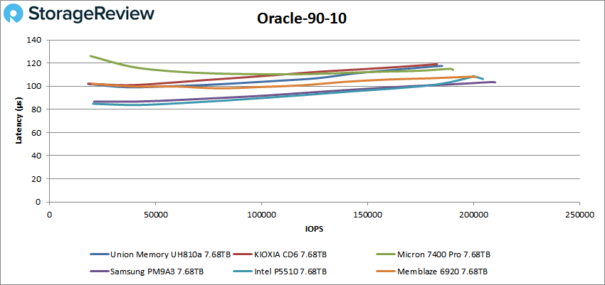 針對Oracle 90-10,UH810a的峰值為185K IOPS、延遲為117.6μs。