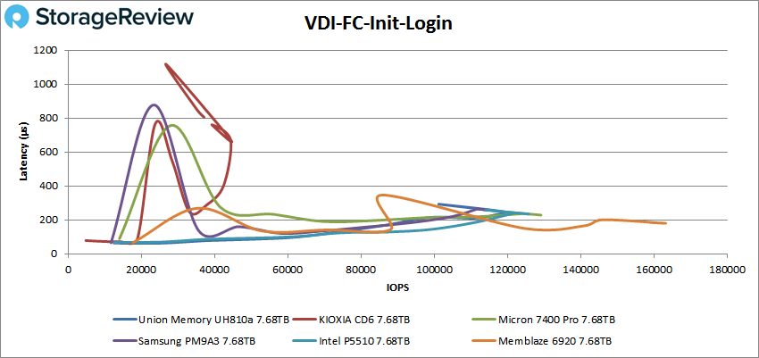 在VDI FC初始登錄時,UH810a達到119K IOPS(247.4μs)的峰值。