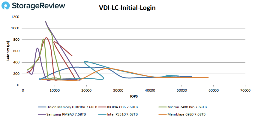 在 VDI LC初始登錄中,UH810a的性能再次非常一致,以僅146.8μs的延遲達到了53K IOPS的峰值。