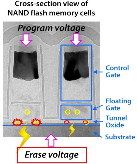 耐久度表征NAND Flash能夠承受的反復(fù)擦寫次數(shù)。NAND Flash的擦寫次數(shù)是有限的,因?yàn)槊看尾翆懖僮鞫紩?huì)對(duì)介質(zhì)造成損傷。如下圖所示,進(jìn)行擦寫操作時(shí),會(huì)用十幾伏特的高電壓對(duì)晶體管進(jìn)行充放電操作,當(dāng)高能電子來回的穿越絕緣層,就會(huì)給絕緣層帶來物理損傷,最終影響數(shù)據(jù)可靠性。