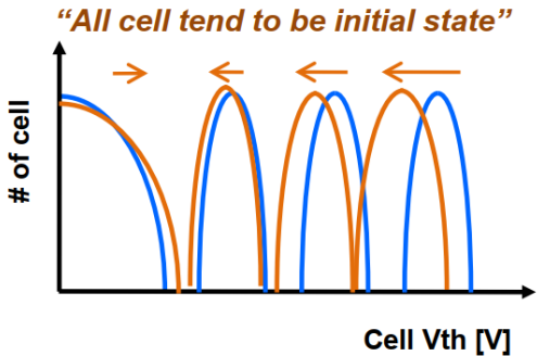 隨著時(shí)間流逝,受量子隧穿效應(yīng)影響,編程操作充進(jìn)去的電子會(huì)隨機(jī)發(fā)生電子逃逸,進(jìn)而影響存儲(chǔ)的信息。如下圖所示,編程操作后的電荷分布如藍(lán)色線所示,Retention后電荷分布向左偏移,影響數(shù)據(jù)的正確讀取。