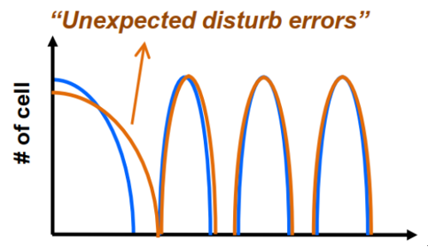 受閃存陣列結(jié)構(gòu)影響,我們?nèi)プx一個(gè)Page時(shí),要對(duì)其他位置上的非讀page也施加一個(gè)電壓,造成讀干擾效應(yīng)。讀次數(shù)較少時(shí),讀干擾影響不明顯,但是當(dāng)次數(shù)增加到幾千次時(shí),累積的弱編程的效應(yīng)也會(huì)影響數(shù)據(jù)可靠性。如下圖所示,較低的電荷狀態(tài)更容易受到干擾。