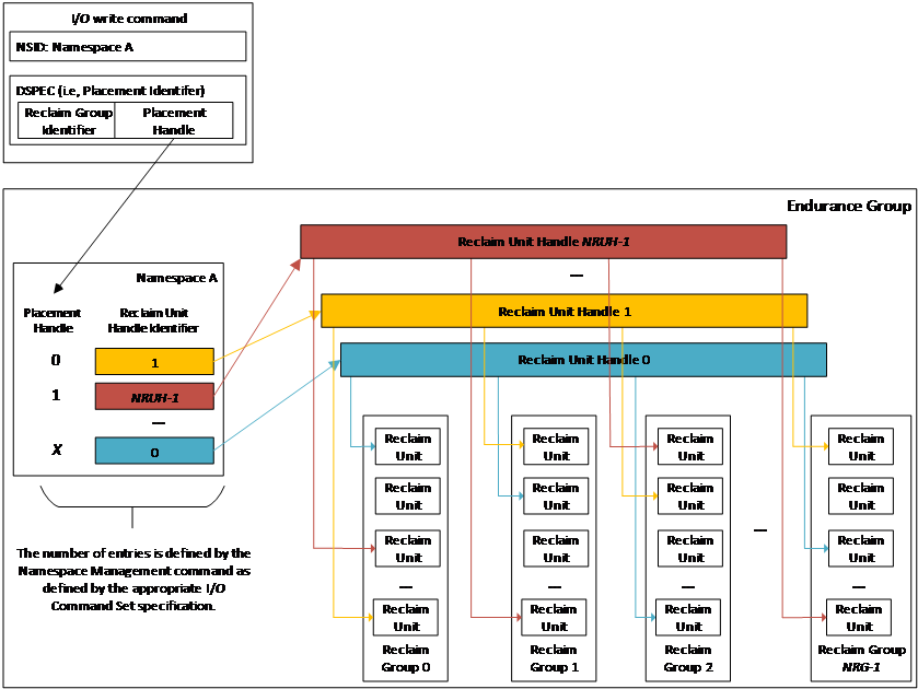 SSD可以將并發NAND拓撲劃分為多個Reclaim Group,做成Reclaim Group間性能隔離。將SSD內的NAND物理block(或者Super block),劃為Reclaim Unit。那么,Reclaim Unit Handle指向不同的Reclaim Unit,可以理解成寫入不同的NAND物理block的寫指針。從系統應用看來,就是在標準IO寫時,通過DSPEC標識,指定寫入到特定性能隔離區域Reclaim Group里面,放置到按類別(不同業務類型或者冷熱度)區分的Reclaim Unit(即NAND block)。