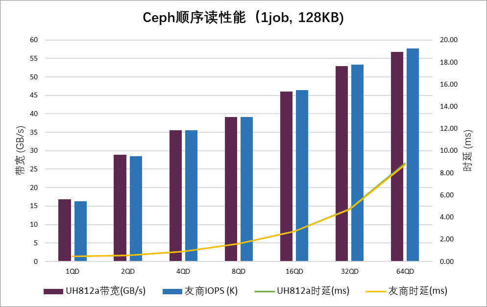 隨著QD數量的增加(QD在64之內),帶寬顯著增長,時延增長緩慢。QD為64時,UH812a順序讀帶寬超過56GB/s,時延為8.85毫秒,平均性能與友商持平;順序寫帶寬超過15.3GB/s,時延為32.88毫秒,平均帶寬超出友商3.15%,平均時延低于友商1.68%。