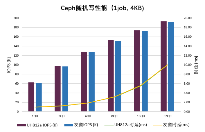 QD為32時,UH812a隨機讀IOPS突破175.5萬,時延穩定在1.1毫秒內;隨機寫IOPS突破19萬,時延穩定在9.9毫秒內。