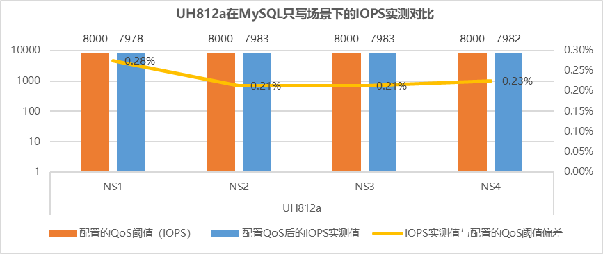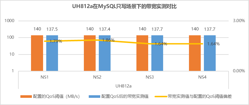 在只寫場景下,當IOPSQoS閾值設置為8000,帶寬的QoS閾值設置到140MB/s時,UH812a依舊展現出強大的流控實力。在IOPS性能方面,其與QoS閾值的最大差距僅為0.28%;在帶寬性能上,最大差距也不過1.86%。由此可見,基于DockerMySQL環境,UH812a NS技術下的QoS功能執行穩定且高效,整體性能波動范圍牢牢控制在2%以內,為高負載業務提供堅實保障。
