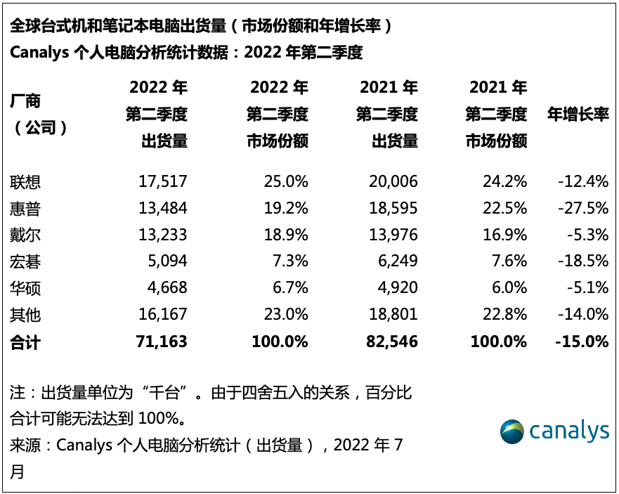 臺式機和筆記本電腦的銷售情況也不容樂觀,第二季度的總出貨量為 7116 萬臺,年均下降 15.0%,這也是自 2020 年首次疫情封控以來的最低銷量。