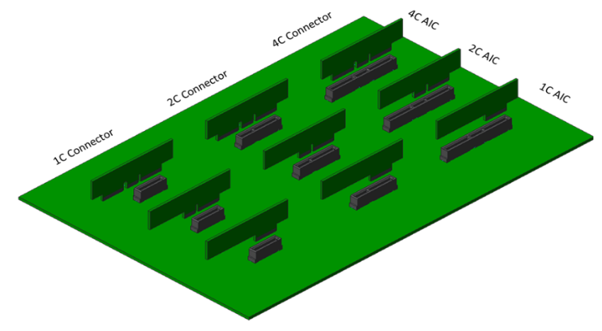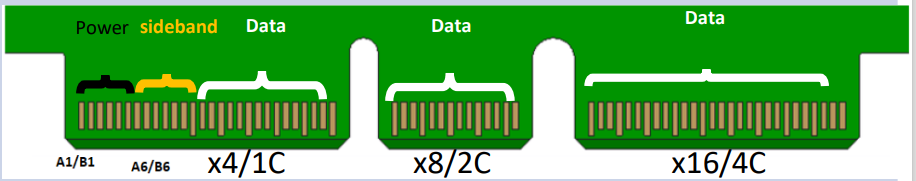 SFF-TA-1002連接器標準定義了一種多通道卡邊緣連接器,指定了四種高密度連接器尺寸:1C、2C、4C和4C+。1C連接器作為所有其他尺寸的通用基礎,1C支持高達80W的12V主電源和3.3 Vaux電源,一組邊帶和管理引腳,以及多達8個高速差分對。2C建立在1C的基礎上,并提供多達16個高速差分對。同樣,4C建立在2C的基礎上,并提供多達16個額外的高速差分對。
