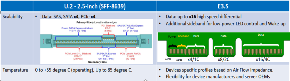 E3.S是E3中尺寸比較接近U.2 2.5英寸盤的版本,二者可以共享一個機箱,實現不同類型硬盤的混合部署。E3設備的連接器尺寸最小的1C型號是23.88mm寬,與M.2連接器大小相同;支持PCIe x16鏈路的4C型號為57.02mm,比U.2的SFF-8639明顯小了許多,背板可以做得更小,降低散熱的流阻,更好的散熱能使E3.S/2T支持到40W,從而適配PCIe Gen5和未來Gen6的性能。另外,一些服務器廠商也在探索基于E3的新型設備,如GPU、FPGA、NIC等,在存儲之外EDSFF E3也將為企業級應用帶來更多可能。
