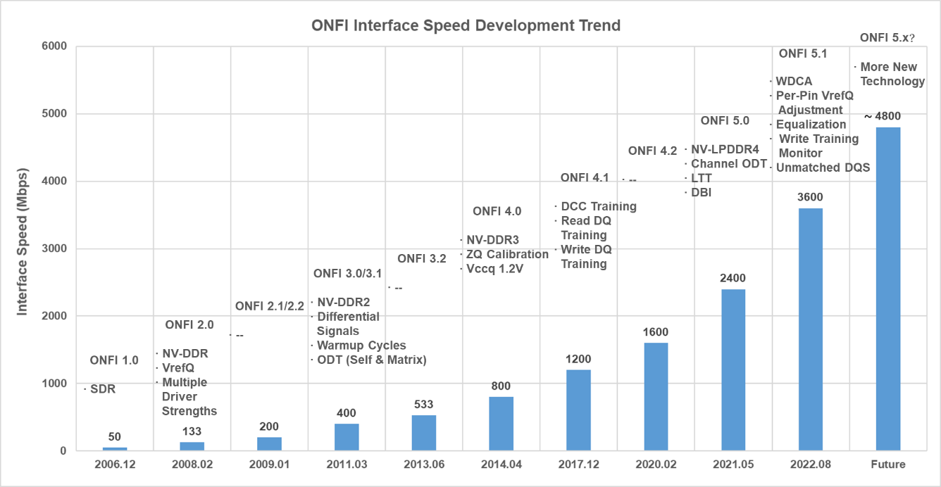 從ONFI 1.0到近期最新發布的ONFI 5.1可以看出,為了匹配系統前端接口(如eMMC/UFS/PCIe)越來越高的帶寬要求,NAND Flash接口速率整整提升了72倍,而且未來還將快速走向下一個峰值。