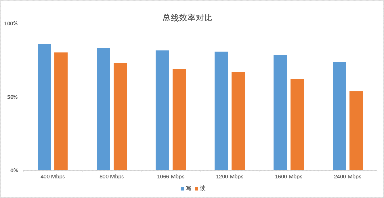 NAND Flash總線上傳輸的信號可分為命令、地址和數據3種,通過DQ[7:0]時分復用,在不同的時刻分別傳輸命令、地址和數據。其中,數據是同步傳輸、差分采樣,速率較高;但命令和地址是異步傳輸、單端采樣,速率較低。從ONFI 1.0到ONFI 5.1,接口速率得到了飛速發展,但命令、地址和數據的傳輸形式基本不變。實際上,隨著總線速率提升,改善的主要是數據傳輸時延,命令和地址的傳輸時延并沒有得到改善,對系統而言總線使用效率是在不斷下降的。如下圖三在樂觀的場景下比較了寫/讀場景的總線效率,可以看到,讀和寫的總線效率都在逐漸降低,尤其是在讀場景跌落到50%左右時進一步加劇了系統設計的挑戰。