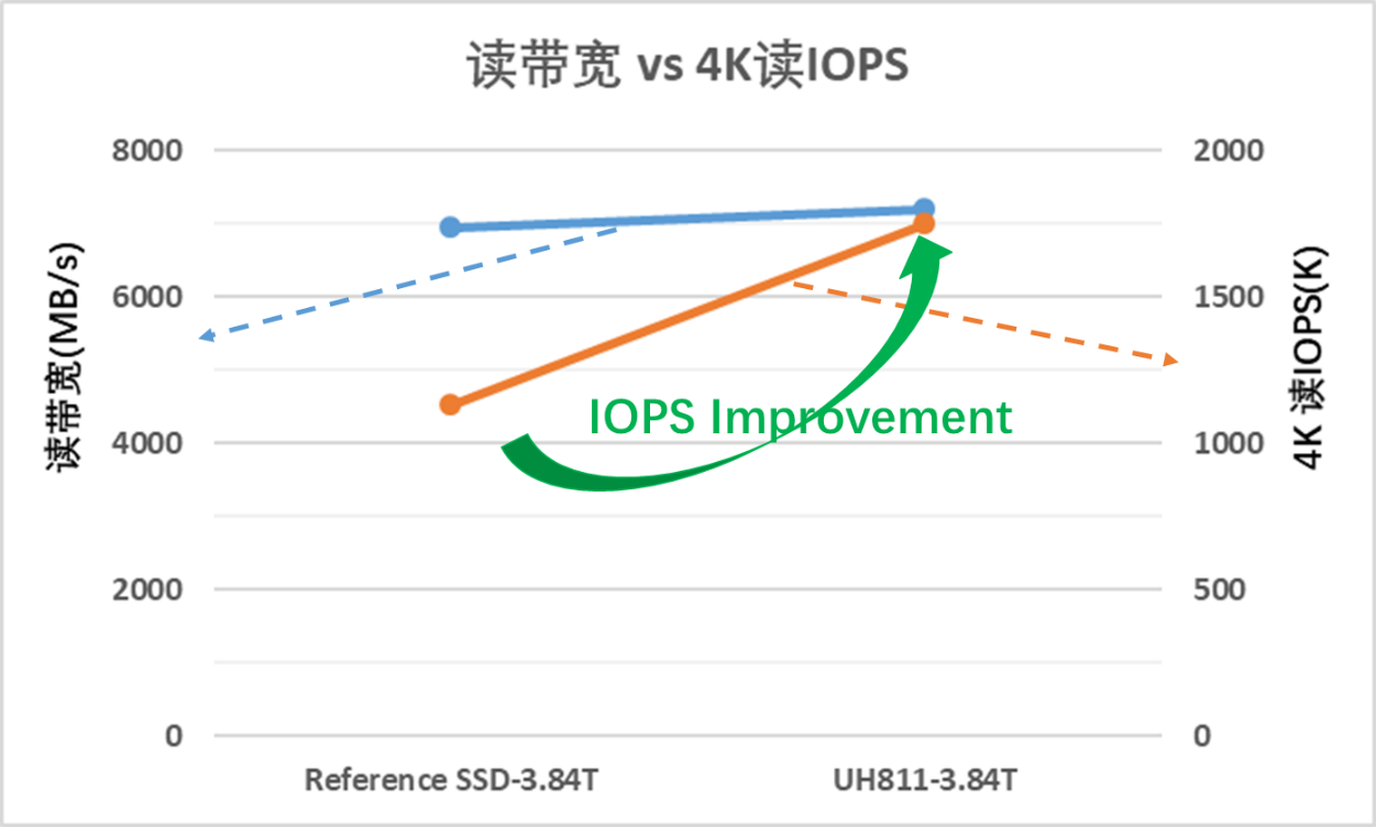 圖四以業內某型號SSD為參考,與憶聯企業級固態硬盤產品UH811a進行了對比分析。可以看到,兩款SSD的讀帶寬相當,都在7000MB/s左右,但UH811a的4K隨機讀IOPS相比參考SSD有顯著提升。進一步分析可以發現,將UH811a的4K IOPS換算成帶寬,是與讀帶寬相當的;但對參考SSD進行同樣的換算,則換算出來的帶寬只有讀帶寬的70%,原因就在于隨機讀操作的總線開銷高于順序讀。