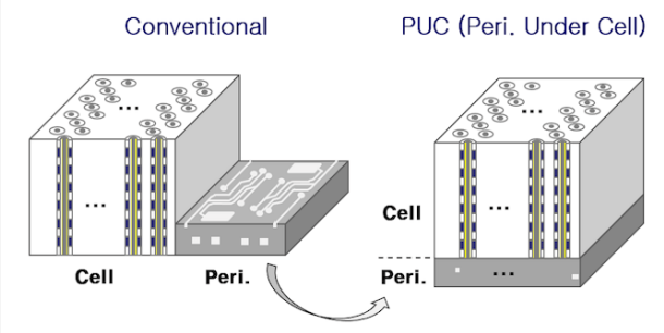 閃存的Die里面分為存儲陣列和外圍控制電路,原來并排分布的,即CMOS Near Array(CNA)。后來隨著尺寸越來越小,外圍電路占的面積越來越大,不利于成本降低,因此把存儲陣列放在了電路下面,即CMOS Under Array(CUA)。