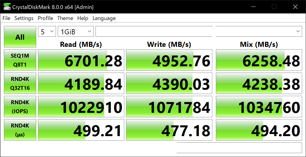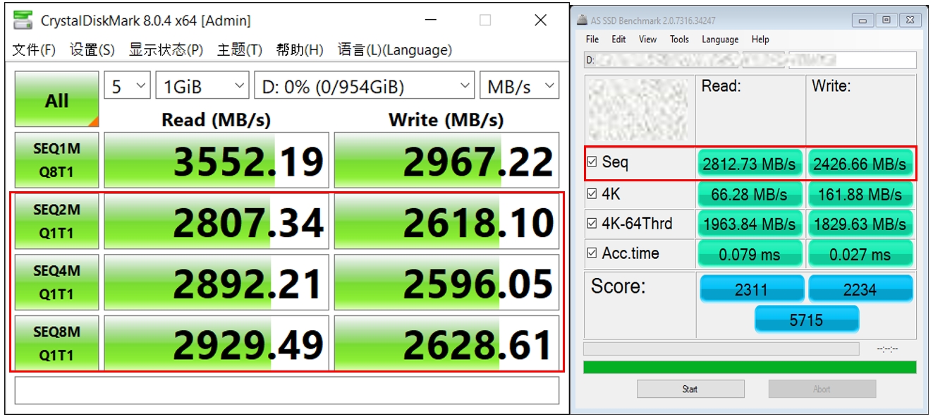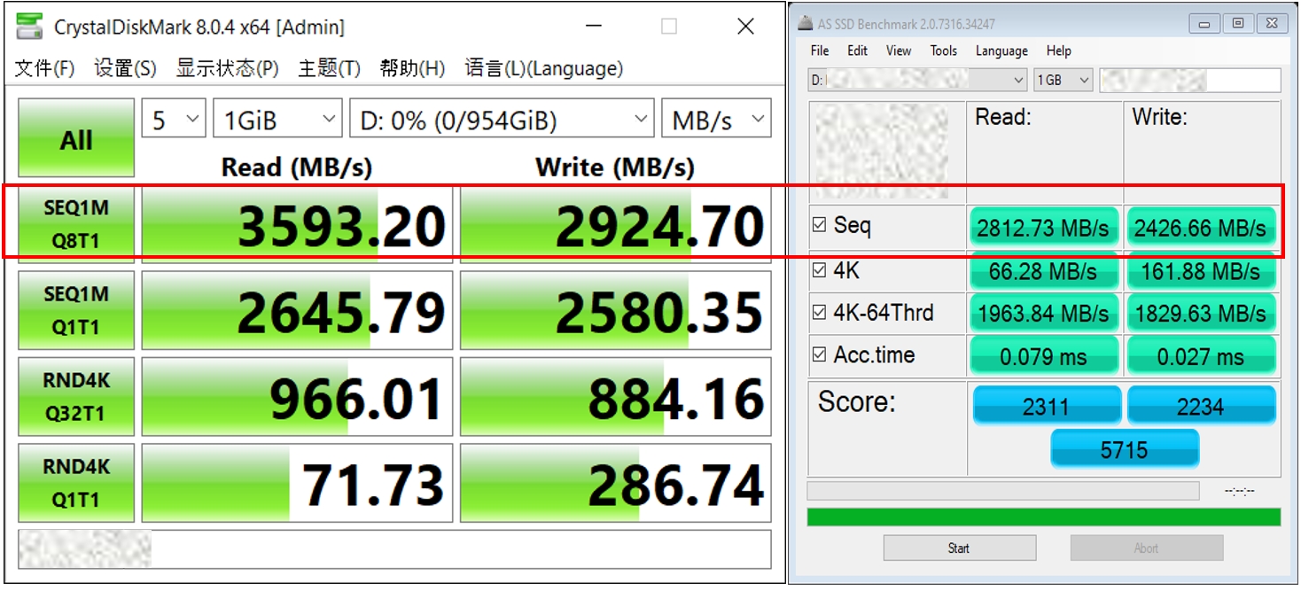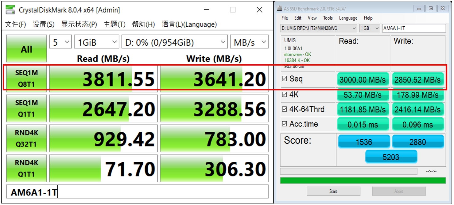 由于每一款測試軟件的側重點不同,測試出的數據也有所差異。以AS SSD和 CDM 為例,并選取憶聯 AM6A1 和另一款原廠友商的 NVMe Gen4 1TB 產品作為測試對象,AS SSD 的順序讀寫性能和 CDM 測出的順序讀寫性能均相差了 1000MB/s 左右。