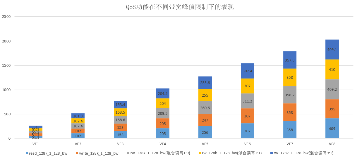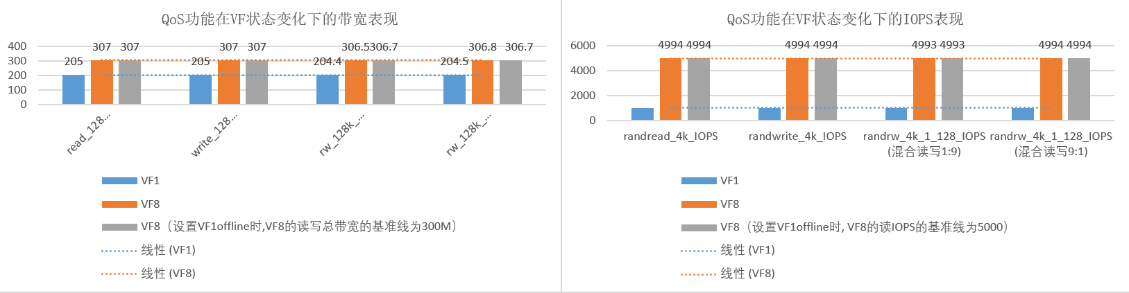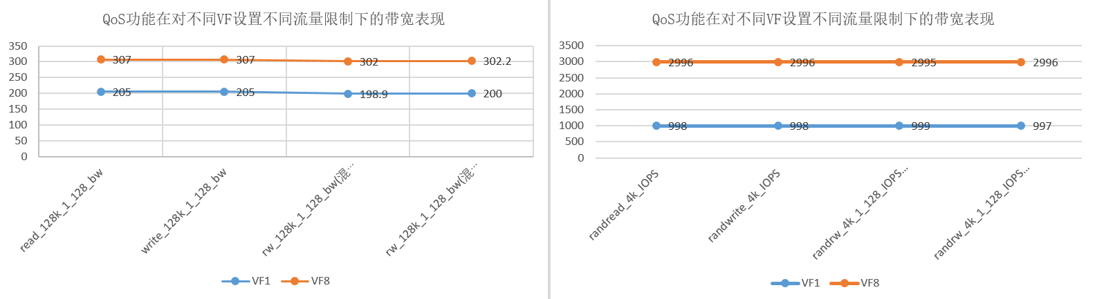 圖 2:QoS 功能在對不同 VF 設置不同流量限制下的帶寬及 IOPS 表現(xiàn)