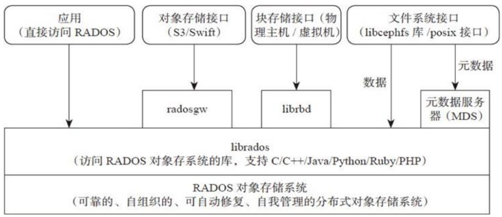 Ceph 主要分為應用接口層、存儲基礎接口層、存儲對象層。接口層主要負責客戶端訪問,分為本地語言綁定接口、塊存儲設備接口和文件系統接口,展現了 Ceph 統一性。