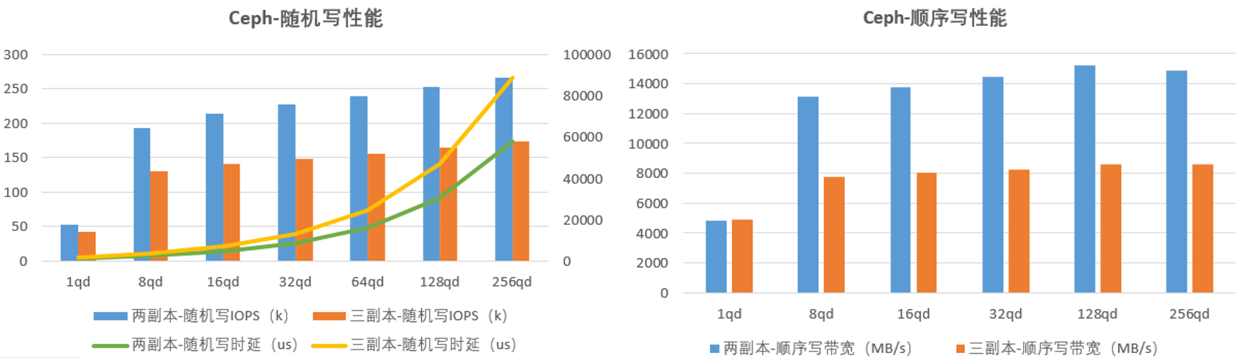 從圖 4 可以看出,在 Ceph 分布式存儲系統下,不論是二副本還是三副本,憶聯 UH8 系 SSD 的讀性能基本持平。在時延方面,二副本與三副本趨勢基本一致,1QD 至 32QD 間較為穩定,在 32QD 后時延明顯增加。
