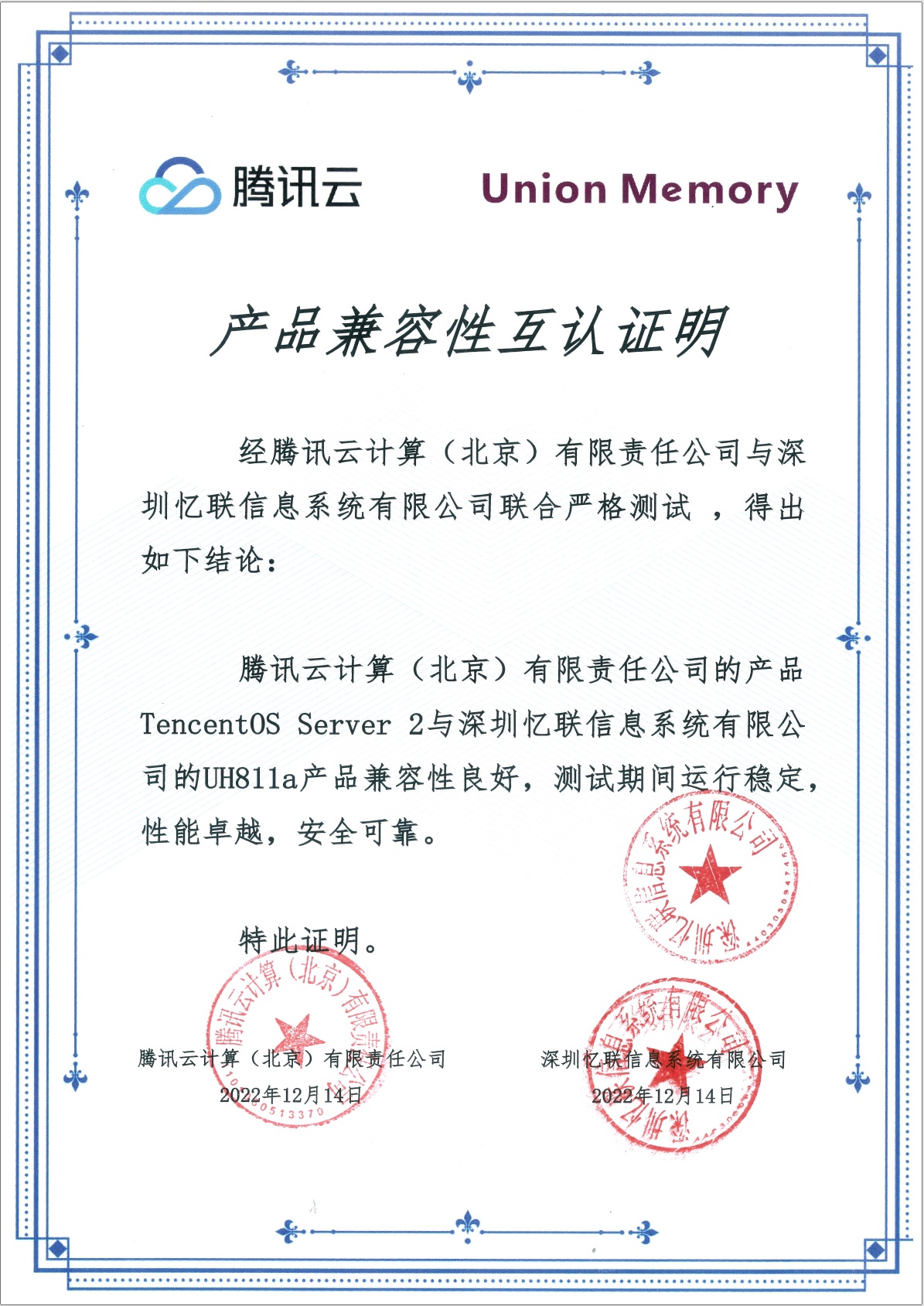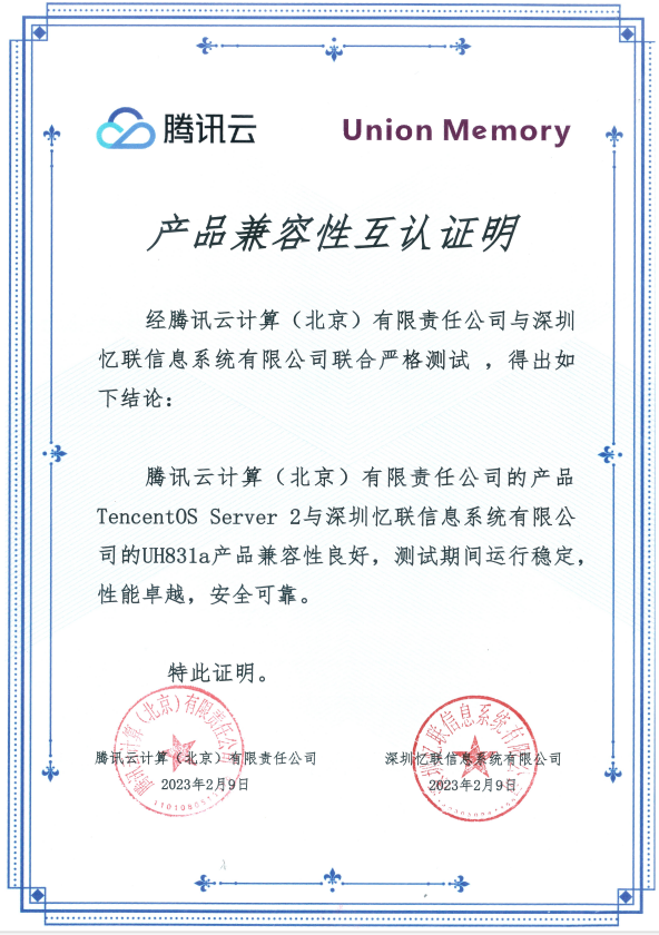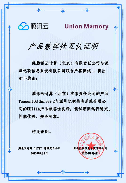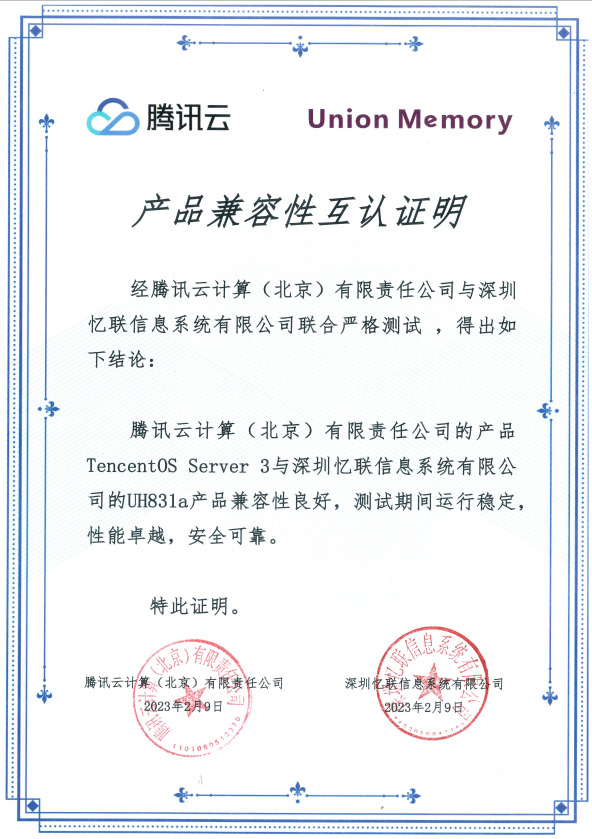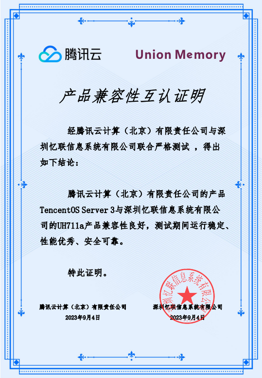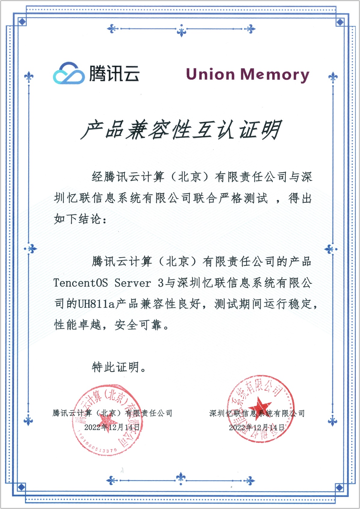 近日,憶聯企業級SSD產品UH811a / UH831a和憶聯數據中心級SSD產品UH711a與騰訊云操作系統完成產品兼容性互認證明。在聯合測試環節,UH811a / UH831a 和 UH711a與 TencentOS Server 3和TencentOS Server 2 的兼容性表現良好,測試期間運行穩定、性能優秀、安全可靠,可滿足用戶在TencentOS Server 系統下的各項應用請求,最終成功與兩大操作系統獲得產品兼容性互認證明。