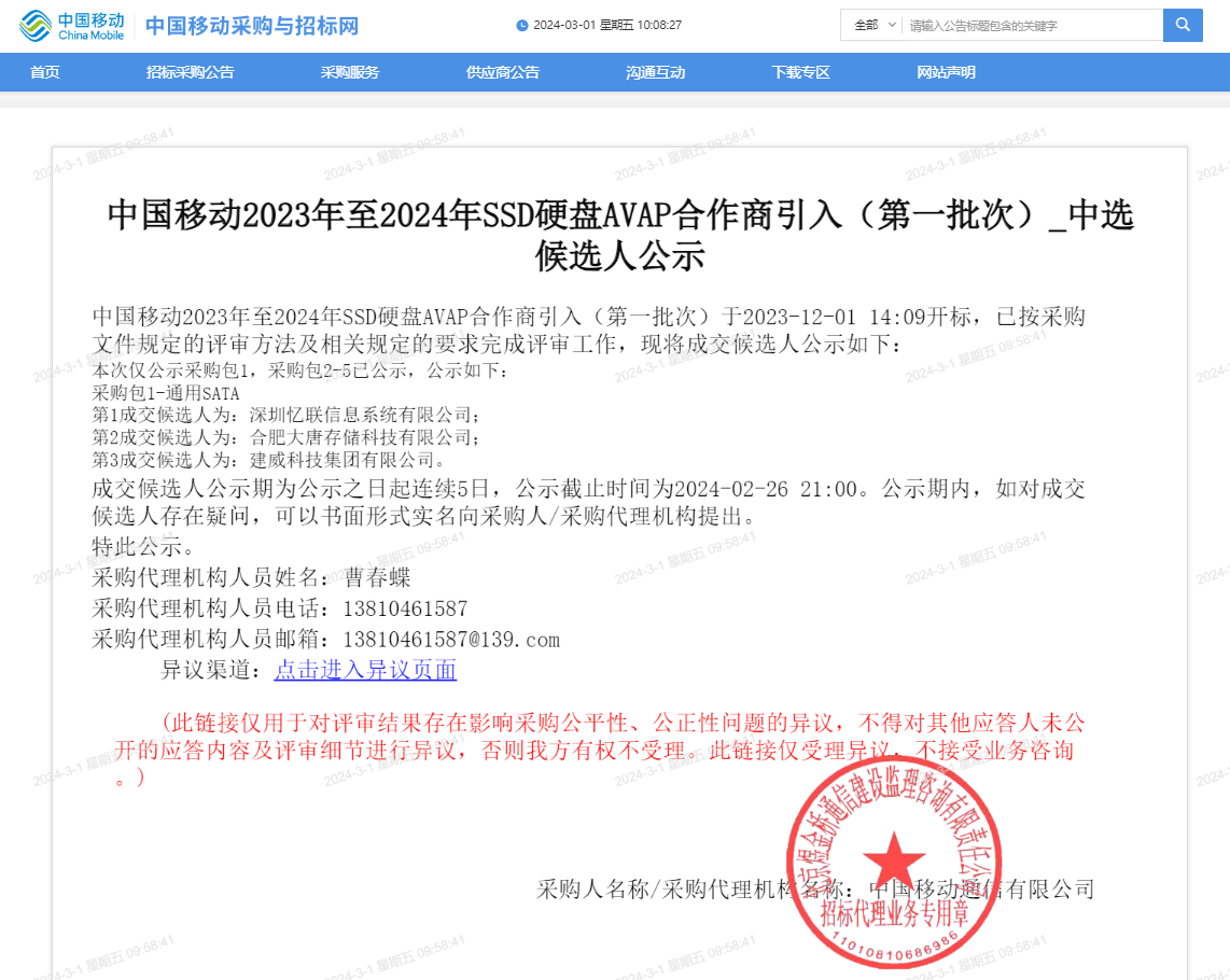 近日,中國移動公示了2023年至2024年SSD硬盤AVAP合作商第一批次引入項目采購包1-通用SATA的中標候選人,憶聯以第1成交候選人中標。