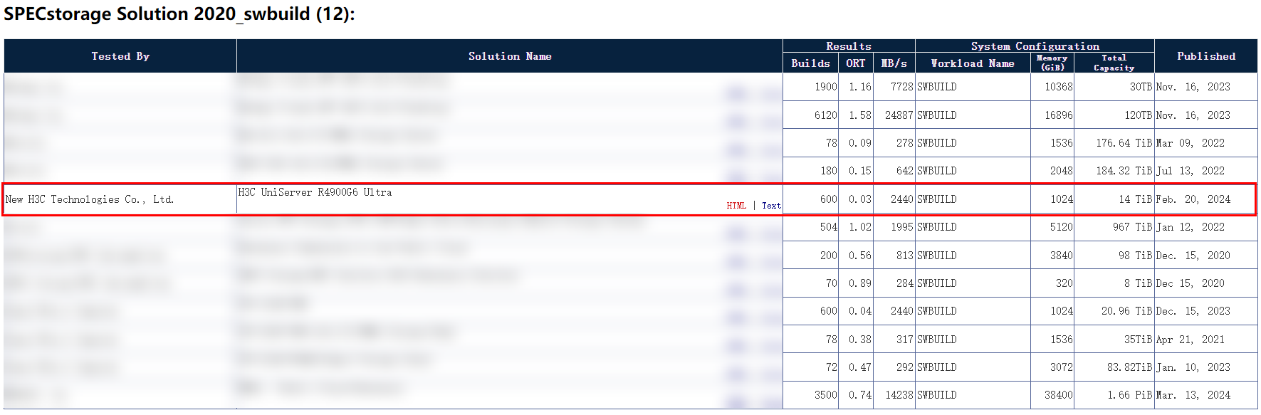 近日,國際標準性能評估組織(Standard Performance Evaluation Corporation, SPEC)的SPECstorage Solution 2020基準評測中,搭載憶聯企業級固態硬盤UH811a的新華三UniServer R4900 G6 Ultra服務器在AI_IMAGE、EDA_BLENDED、SWBUILD場景中性能表現優異,總體響應時間(overall response time, ORT)均處于領先水平,從側面印證了憶聯企業級產品可為服務器在性能、可靠性、能效和可擴展性方面帶來顯著優勢。
