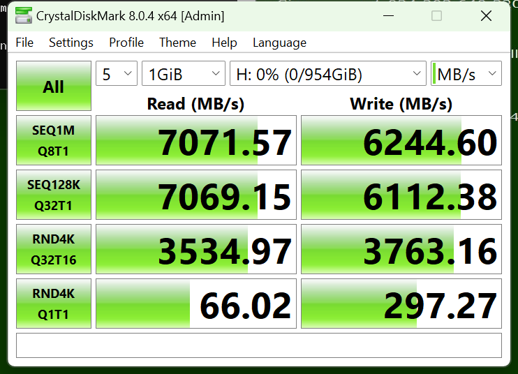 為進一步驗證產品的真實性能,借助專業固態硬盤檢測工具Crystal Disk Mark對憶聯AM6B1進行了測試。結果表明,憶聯AM6B1在順序讀寫方面展現出了卓越的性能,分別超過了7000 MB/s和6200 MB/s的速度閾值,充分證明了憶聯AM6B1在數據傳輸方面的高效性和穩定性。