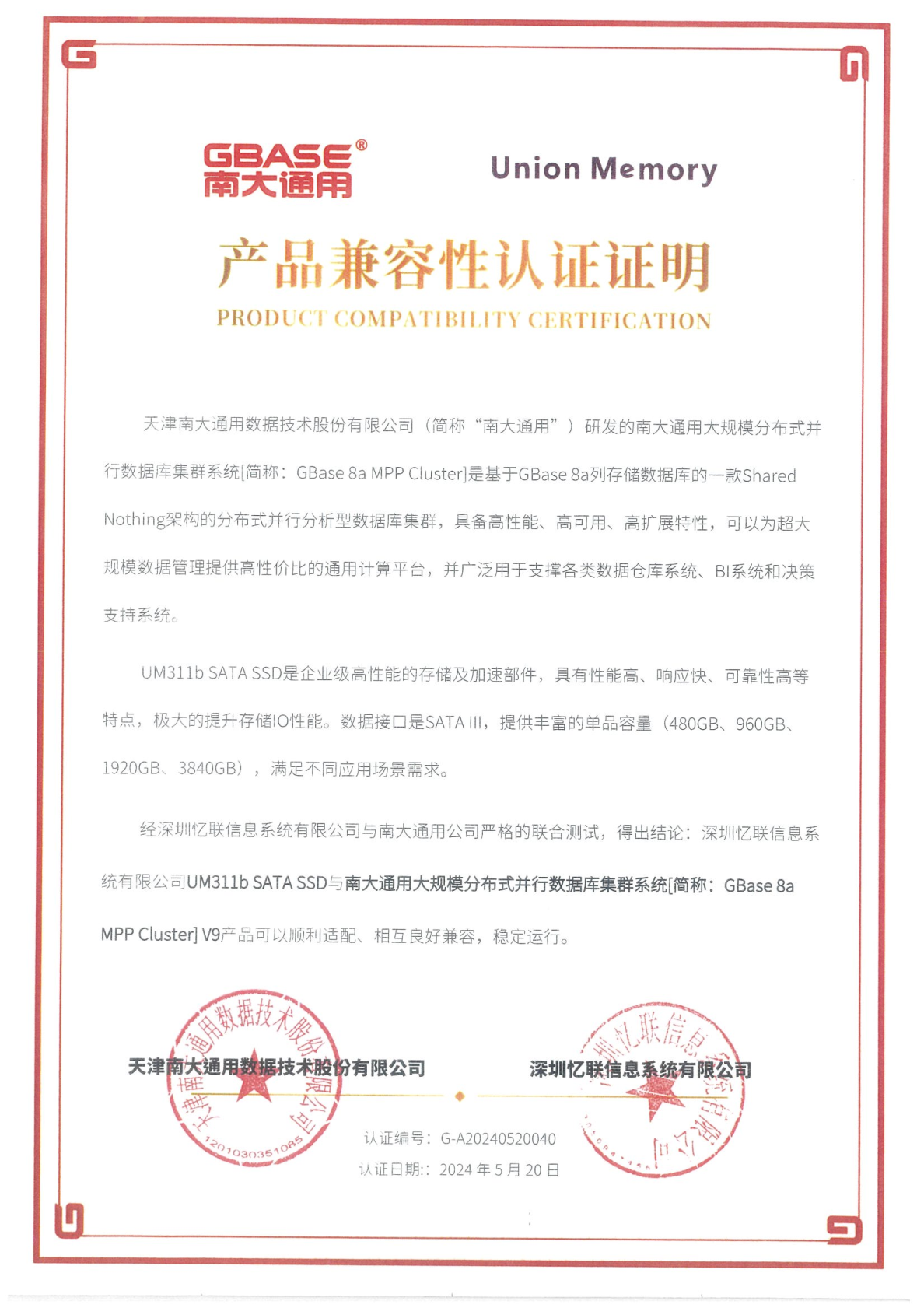 此次通過GBase 8a數據庫的兼容認證,不僅表明了憶聯UM311b能夠高效支撐Gbase 8a數據庫的高并發訪問與數據處理需求,還證明了憶聯UM311b能為Gbase 8a在云計算、大數據分析等前沿領域的應用提供堅實的存儲基礎,助力企業構建更加高效、可靠的數據處理系統。