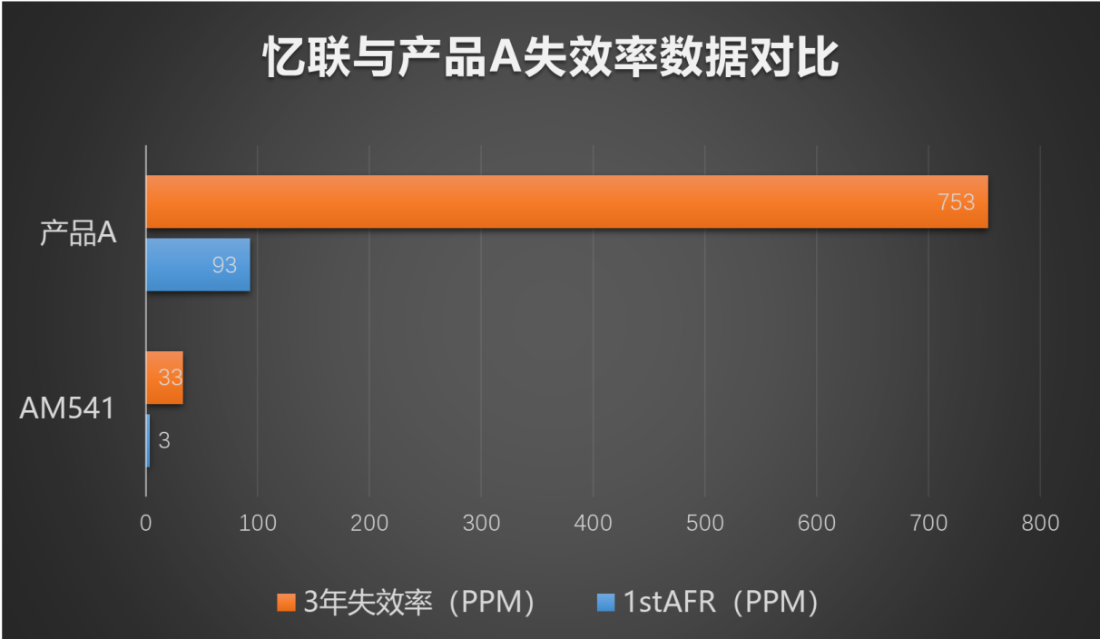 以拉薩3650米海拔作為參考,AM541在3600+米高海拔地區的首年失效概率僅為0.0003%(可靠度99.9997%),產品質保期3年失效概率僅為0.0033%(可靠度99.9967%)。相比之下憶聯AM541的可靠性指標遠遠高于友商,可為用戶營造滿滿的“安全感“。