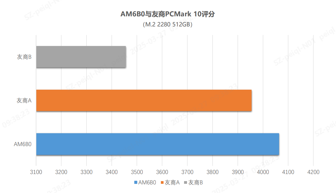 為驗證產品的綜合性能,測試團隊在諸多辦公場景下對AM6B0進行了全面基準測試。在PCMark 10測試中,AM6B0在多個容量點(如512GB、1TB)的綜合評分都超過了4000分,不僅在同系產品中處于領先,同時也高于友商的同類產品。這一得分驗證了AM6B0的綜合性能,不僅能在日常的辦公、娛樂場景中綽綽有余,即使面對中高強度的專業應用(如視頻剪輯、工業制圖、3D渲染、大型游戲)也能輕松應對,以卓越性能為用戶提供流暢的使用體驗。