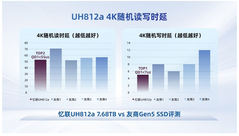穩(wěn)定低延遲:憶聯(lián)UH812a的超低時(shí)延特性突出。4K隨機(jī)讀QD1時(shí)延<55μs,相比上一代(PCIe 4.0 SSD)改善43%,對比國際友商優(yōu)25%,4K隨機(jī)寫性能位列友商TOP1。無論是運(yùn)行復(fù)雜的模擬程序還是處理海量數(shù)據(jù)集,都能達(dá)到微秒級響應(yīng),為高性能計(jì)算與數(shù)據(jù)密集型應(yīng)用筑牢根基。