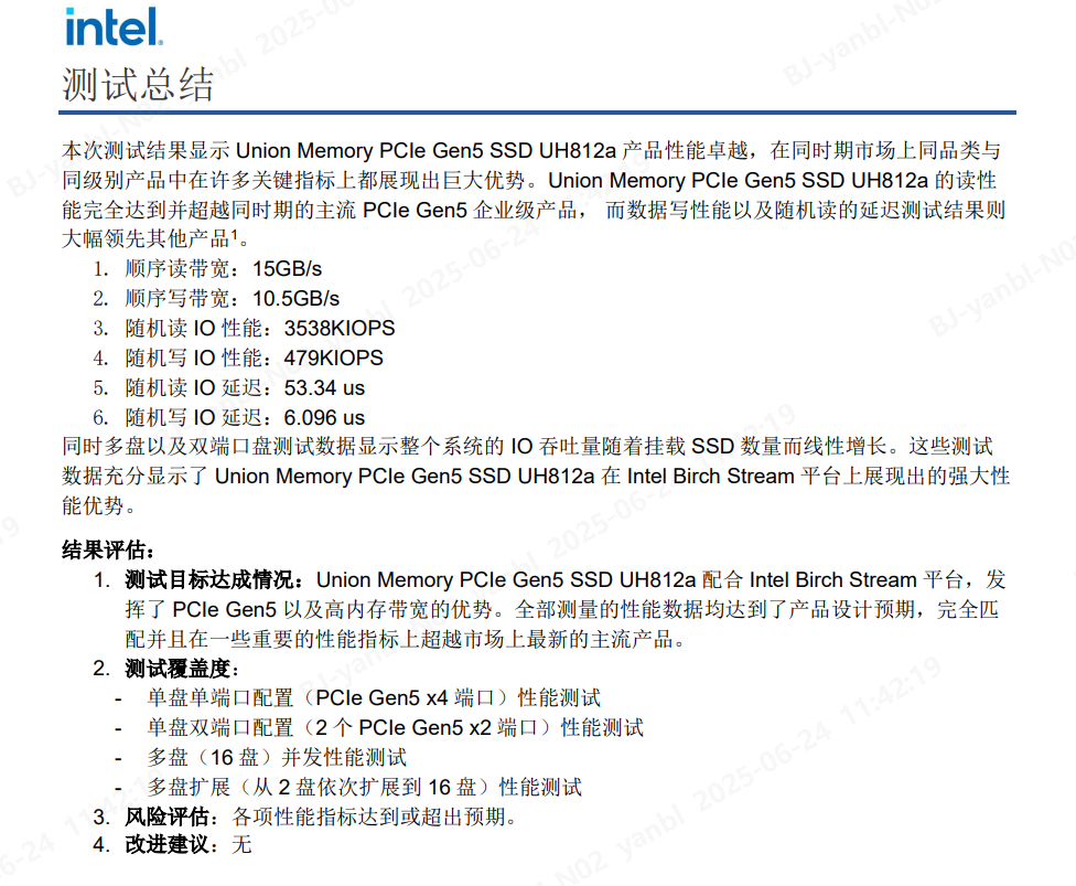 作為Intel DCAI China關(guān)鍵組件驗(yàn)證計(jì)劃的重要組成部分,Benchmark 旨在通過標(biāo)準(zhǔn)化、可重復(fù)的測試方法與指標(biāo)體系,量化評估計(jì)算機(jī)硬件或軟件在特定工作負(fù)載下的性能表現(xiàn),通過覆蓋典型用戶場景的全棧驗(yàn)證,范圍貫穿從物理層信號完整性到應(yīng)用層算法的完整技術(shù)鏈,充分彰顯憶聯(lián)行業(yè)領(lǐng)先的技術(shù)實(shí)力。