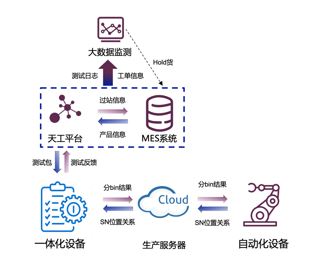l 生產(chǎn)與測(cè)試協(xié)同:一體化設(shè)備對(duì)接天工平臺(tái),執(zhí)行測(cè)試指令并實(shí)時(shí)反饋測(cè)試結(jié)果,天工平臺(tái)與MES系統(tǒng)交互產(chǎn)品和過(guò)站信息。