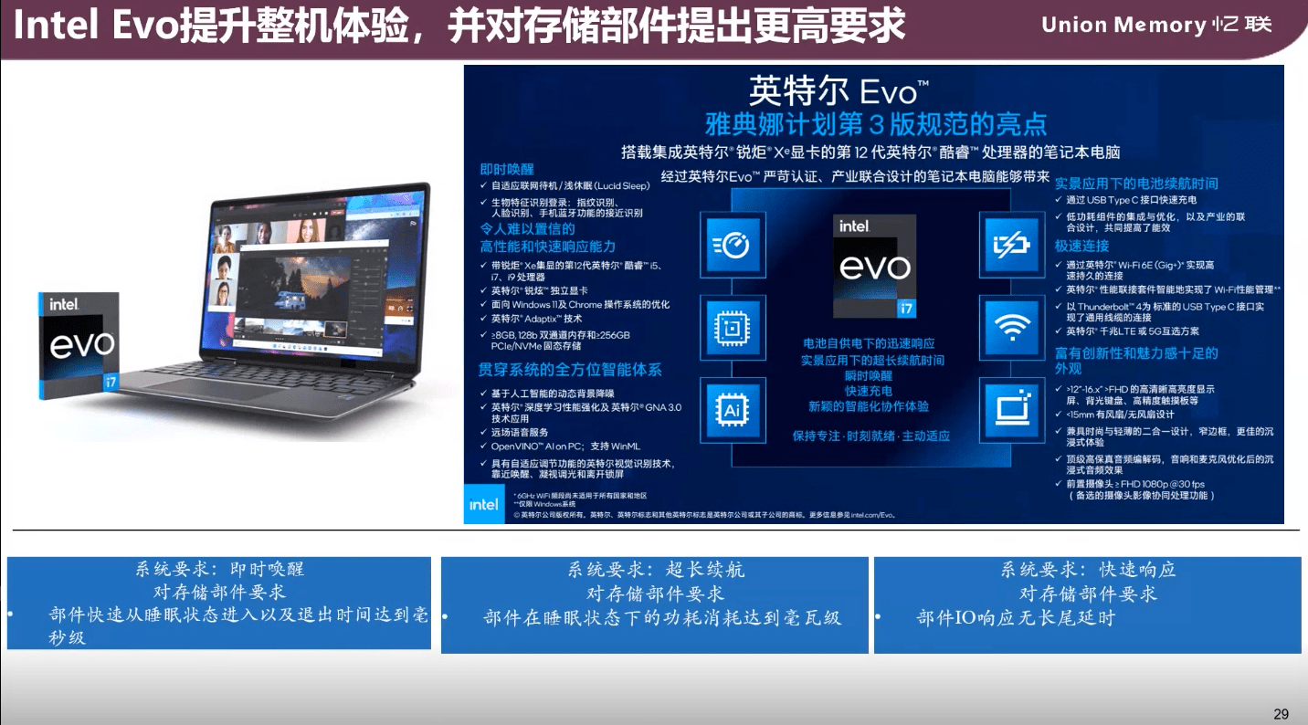 隨著英特爾第12代酷睿處理器的發布,更嚴苛、更細致的Evo 3.0規范隨之而來,其中筆記本的響應速度是Evo 3.0認證的重要標準之一,固態硬盤在其中展現出了重要作用,作為國產SSD廠商中的領先者,憶聯成為國內首家通過英特爾Evo整機認證的SSD廠商。