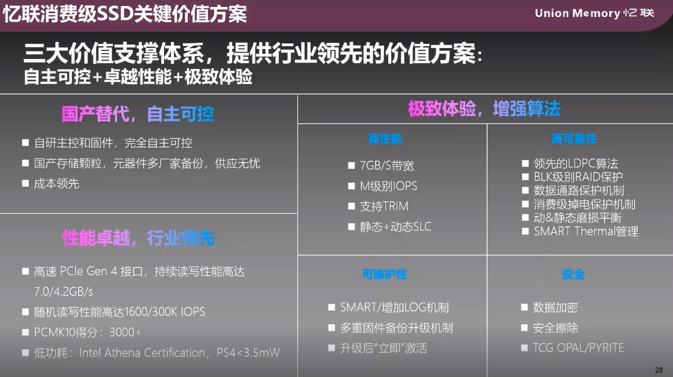 自成立以來,憶聯緊密圍繞客戶與市場需求,持續提升技術創新能力,一直以卓越的產品性能引領行業標準。比如在PCIe Gen 4的產品上憶聯有著讀寫性能高達4.2G和7G的高端產品,同時憶聯在算法上也積累了許多經驗,在如何提升性能、可靠性、維護性和安全方面都有著自研的算法,為憶聯始終在行業內保持領先地位提供了有利保障。