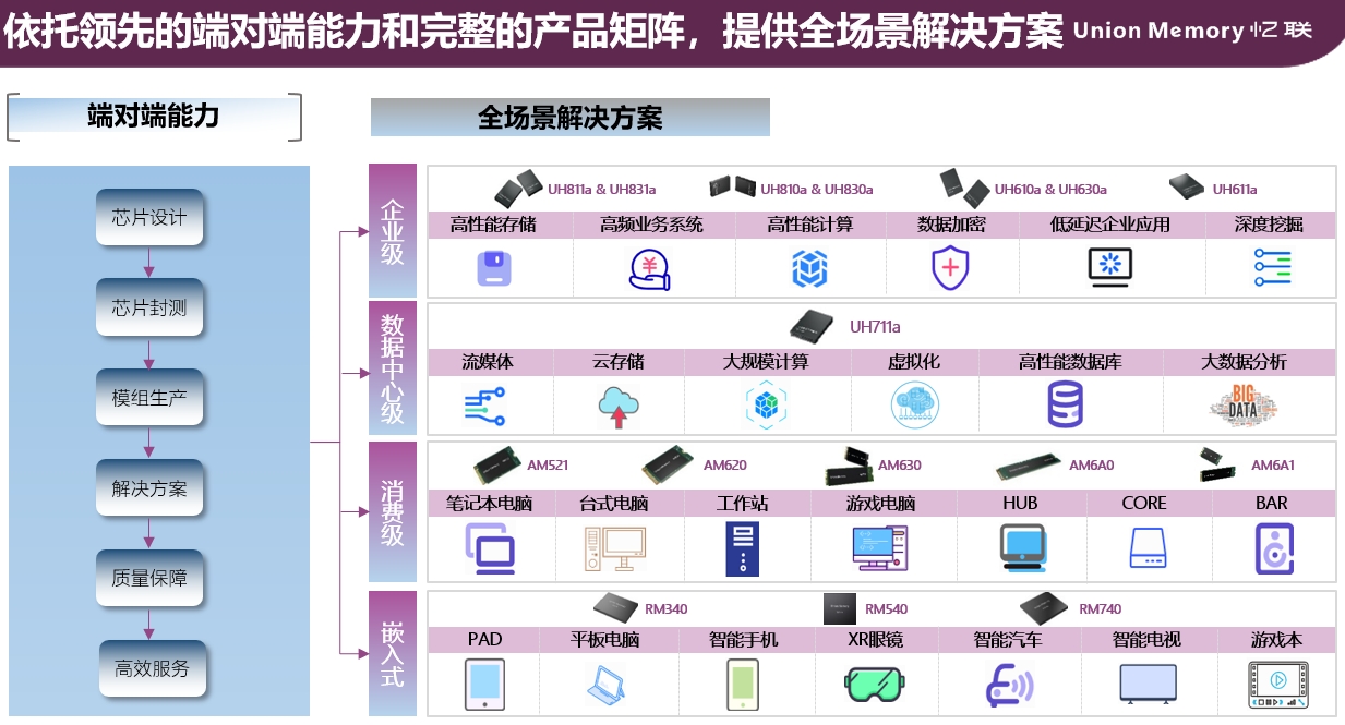 作為國內存儲領導廠商,憶聯致力于通過端到端、自主可控的SSD全棧解決方案,為服務器、數據中心、個人電腦、移動終端、智能穿戴等應用提供從芯片設計到固件的獨立研發、算法和介質研究,以及晶圓封測,模組制造,面向全場景、全行業的端到端的存儲解決方案與產品。