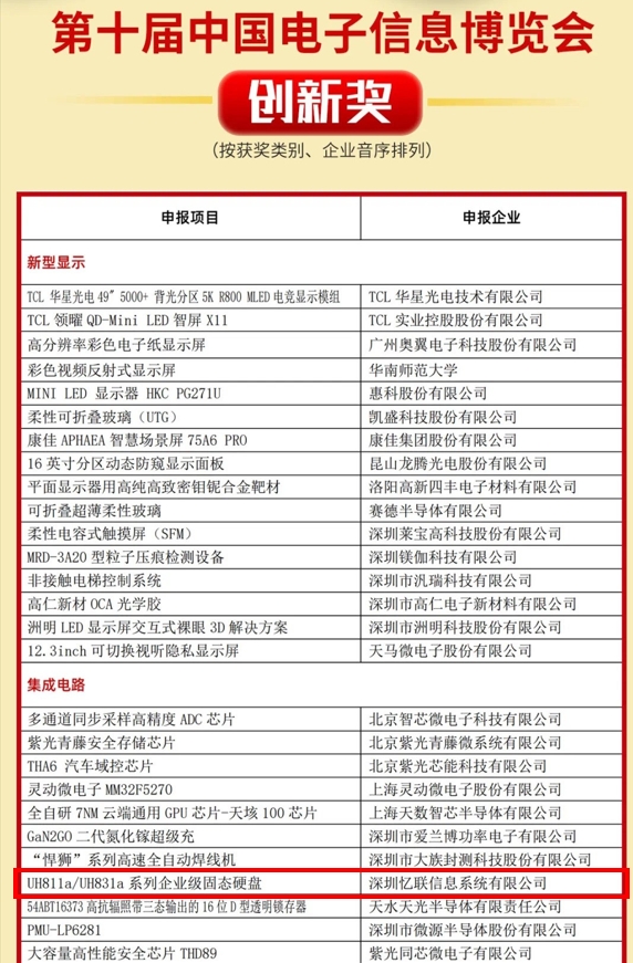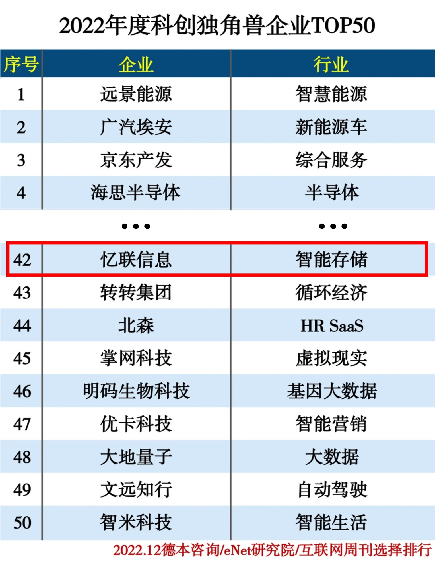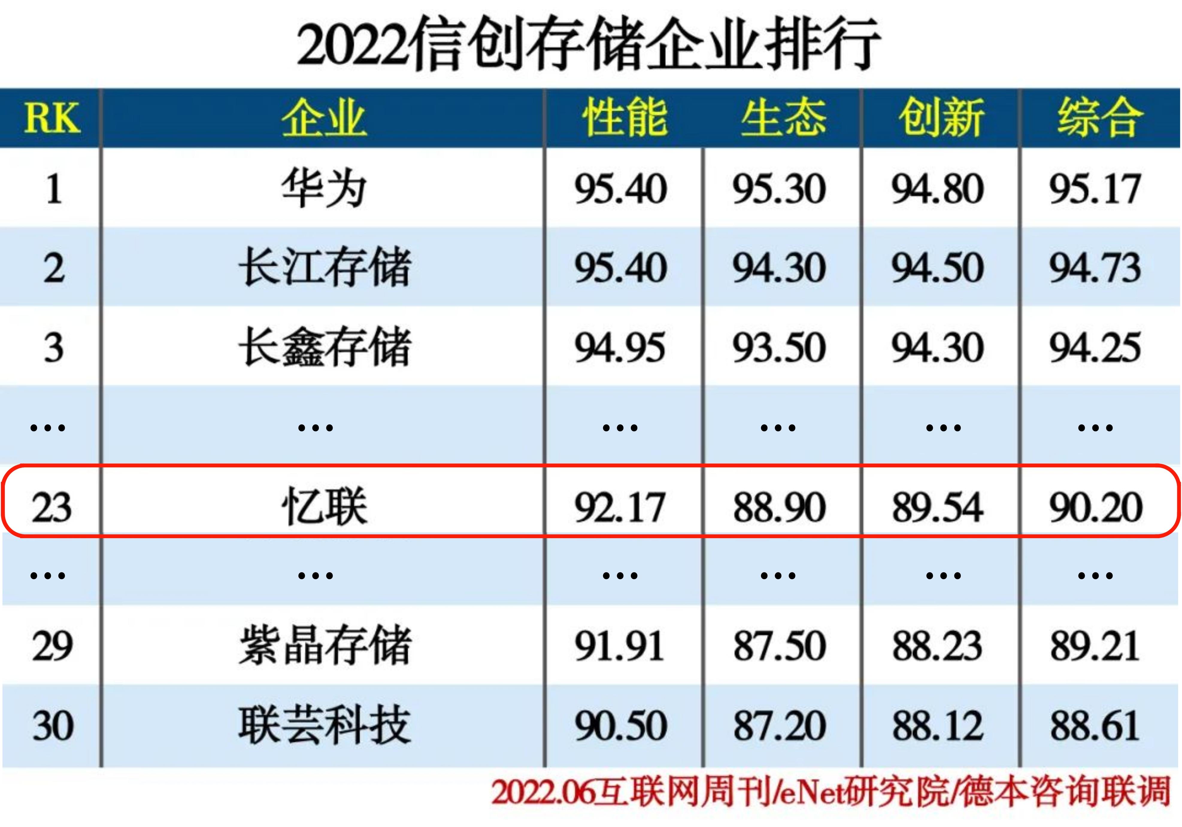 由中國科學院旗下權威媒體《互聯網周刊》、eNet研究院、德本咨詢聯合發布的《2022信創產業分類排行榜》中,憶聯憑借領先的自主研發實力和綜合發展實力榮耀上榜,躋身信創存儲企業30強;同時,上榜《2022年度科創獨角獸企業TOP50》,智能存儲領域排名第1,總排名第42名。