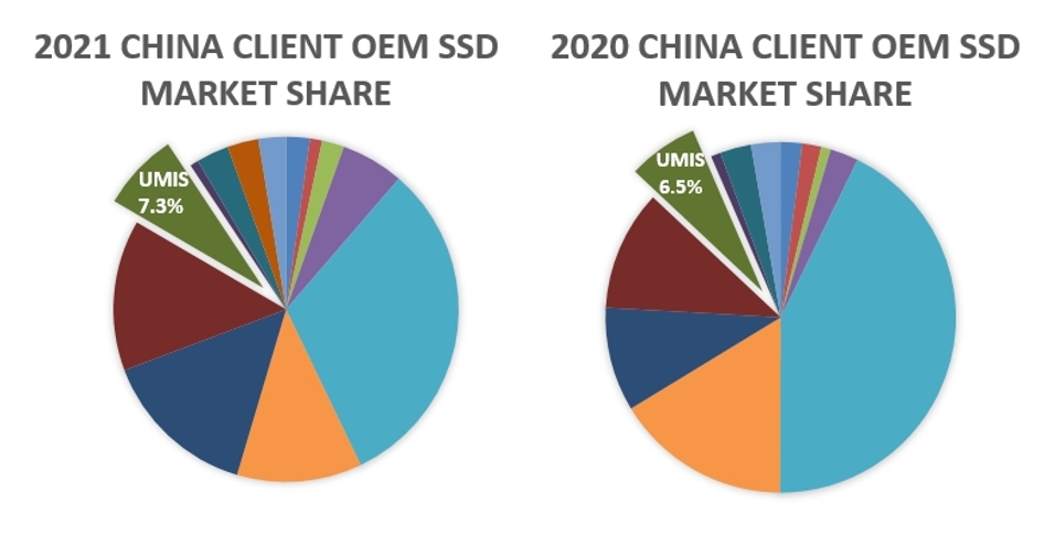 2022年,在專業存儲研究機構Forward Insights發布的新版《中國固態硬盤市場》報告中,對2021年中國固態硬盤市場份額做了統計分析,在中國Client OEM SSD市場,憶聯市場份額排名第五,位列國產廠商第一,同時,市場份額也從2020年6.5%提升至7.3%。