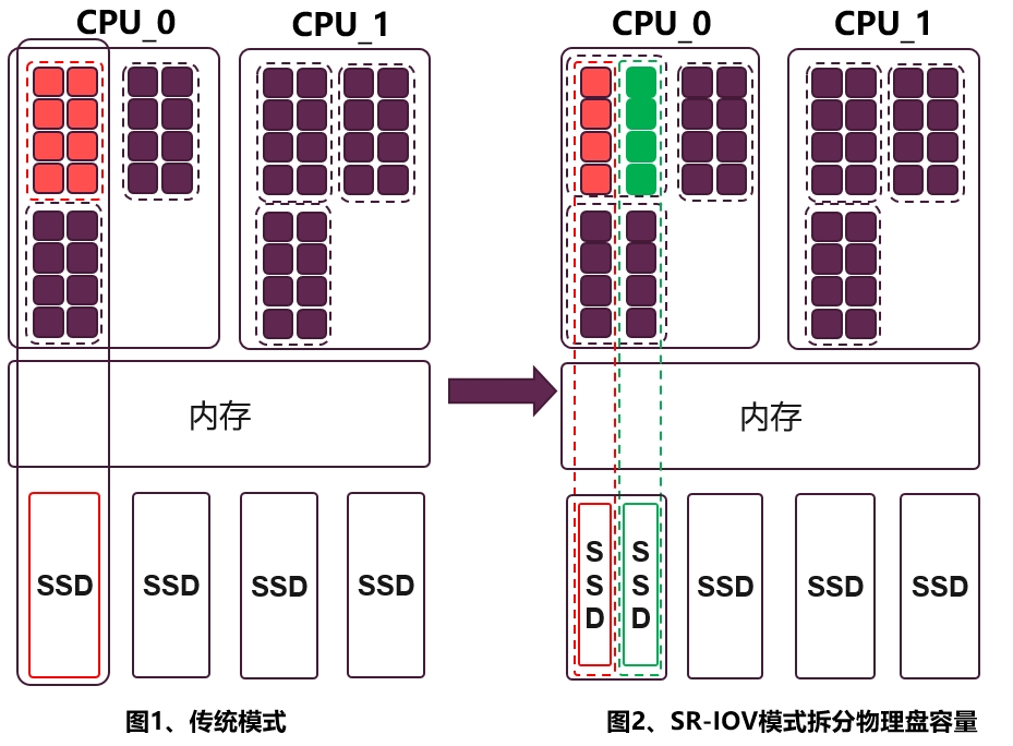 本次驗證,在虛擬化分區方式的場景下,通過 SR-IOV 技術將一片 PCIe 4.0 3.84TB SSD(綁定 16 個 CPU 核)配置為 2 個容量為 1.92TB VF(綁定 8 個 CPU),4 個 960G VF(綁定 4 個核),8 個 480G VF(綁定 2 個核),如下示意圖。