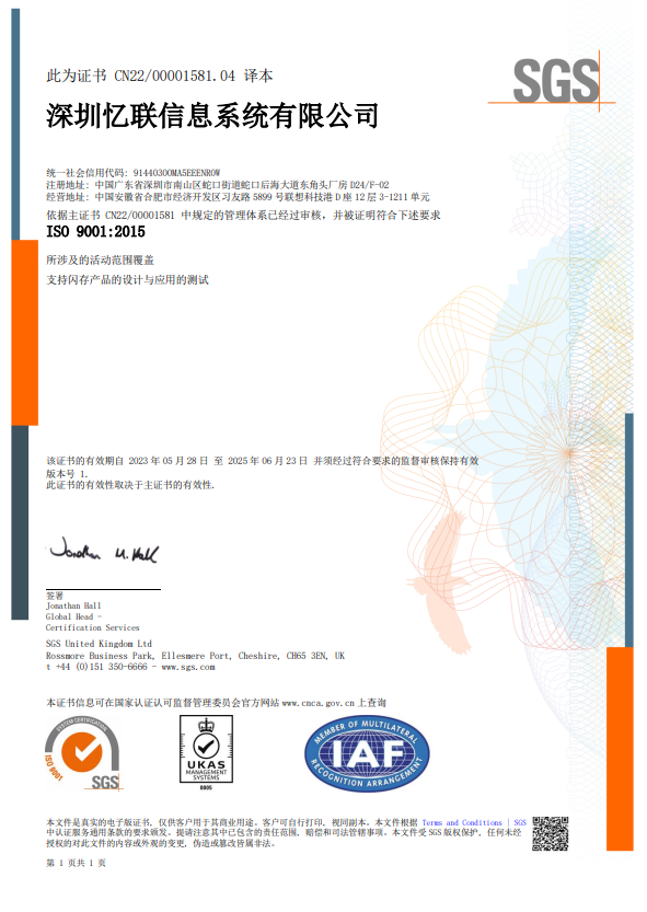 在成立三周年之際,獲得ISO9001認(rèn)證標(biāo)志著聯(lián)合實(shí)驗(yàn)室已步入規(guī)范化、標(biāo)準(zhǔn)化、科學(xué)化的管理軌道,也將為聯(lián)合實(shí)驗(yàn)室的測(cè)試能力和測(cè)試品質(zhì)提供強(qiáng)有力的保障與背書(shū),并為承接憶聯(lián)存儲(chǔ)產(chǎn)品在客戶端正式導(dǎo)入測(cè)試提供“硬核”支撐。