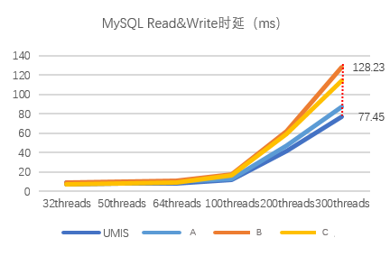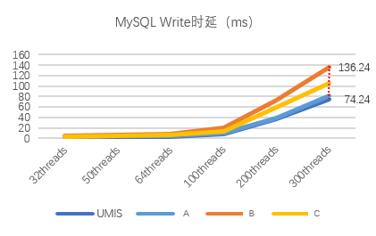如圖4所示,MySQL寫場景下,憶聯(lián)SSD始終保持著明顯優(yōu)勢,性能表現(xiàn)強(qiáng)勁。在吞吐量上,對(duì)比友商最大有266%的提升;在時(shí)延上,最大有83%左右的下降,由此可見,憶聯(lián)UH8系SSD可助力MySQL只寫場景下存儲(chǔ)性能的充分發(fā)揮。